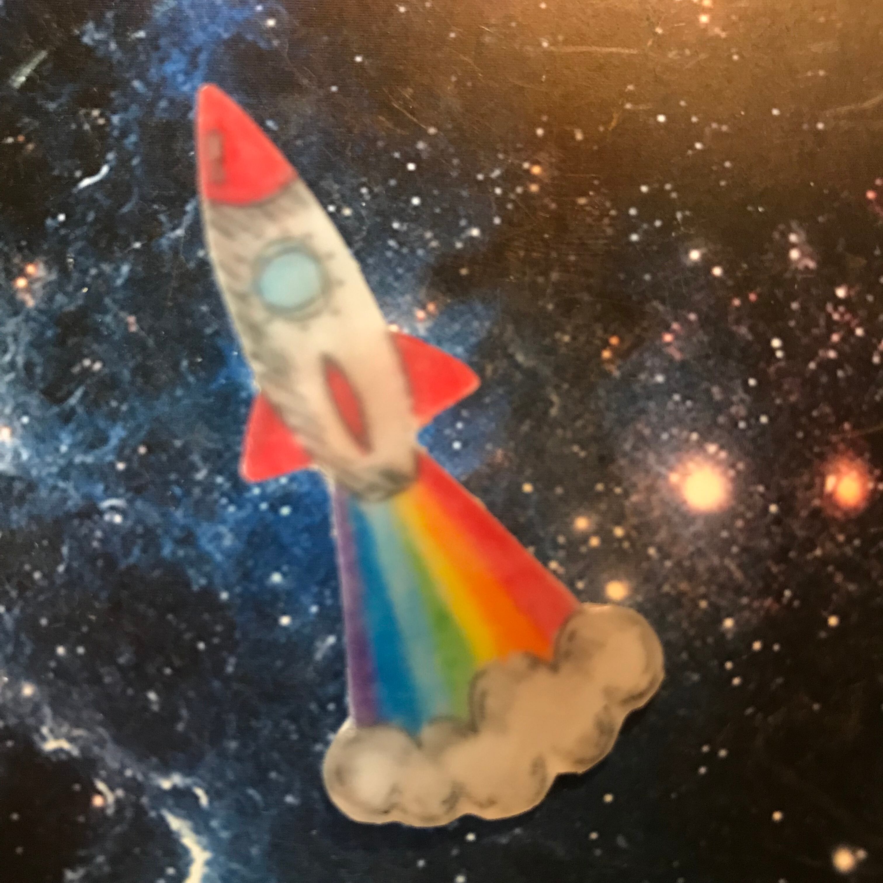 プラ板で創作したロケットキラキラレインボーブローチです。